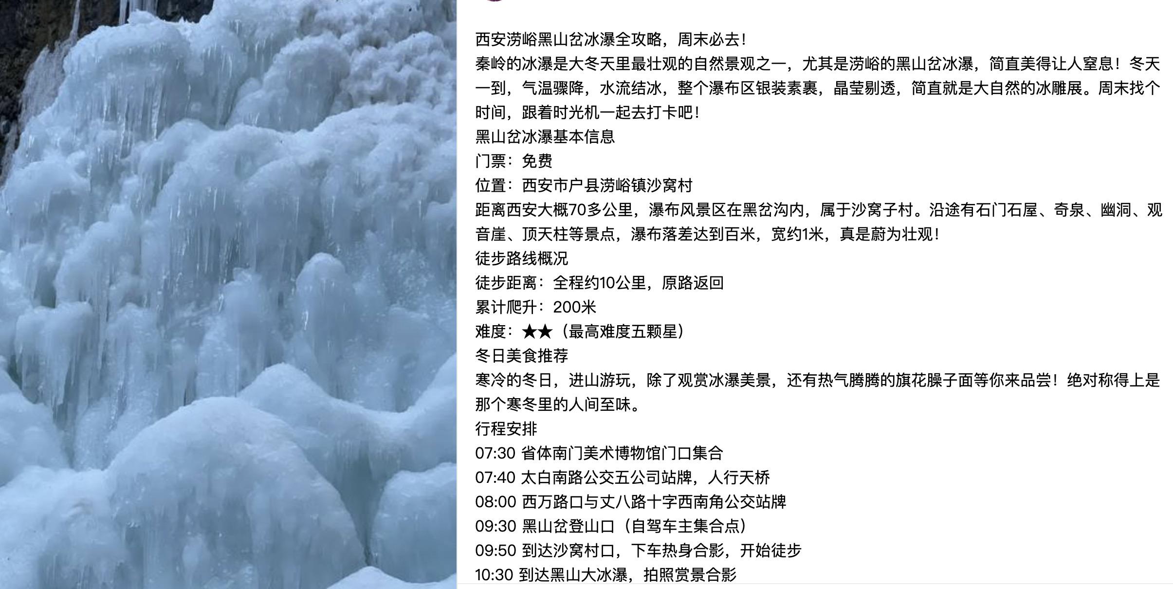 记者注意到,在不少社交平台,冰瀑打卡已经成为一项“网红”活动。相关社交平台还有黑山岔冰瀑打卡的征集贴,贴文描述:秦岭的冰瀑是大冬天里最壮观的自然景观之一,尤其是涝峪的黑山岔冰瀑,简直美得让人窒息!冬天一到,气温骤降,水流结冰,整个瀑布区银装素裹,晶莹剔透,简直就是大自然的冰雕展。