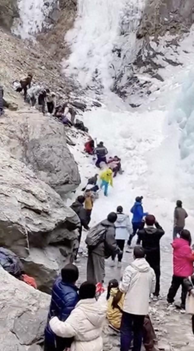 见此情形,正在冰瀑布下面玩耍的游客,纷纷躲避,有人滑倒。