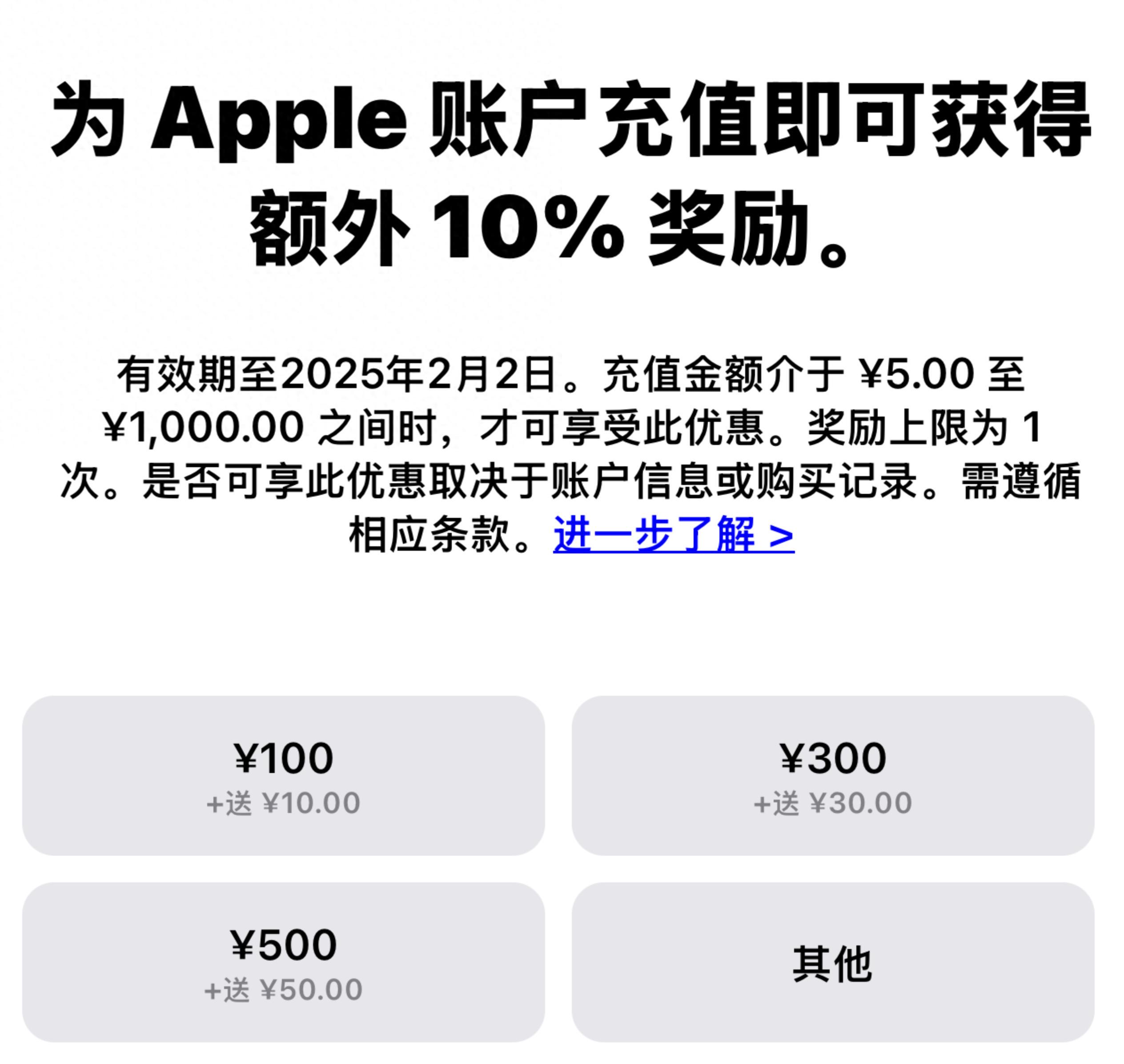 奖励上限为 1 次,是否可享此优惠取决于账户信息或购买记录。例如充值 100 元送 10 元,充值 300 元送 30 元,充值 500 元送 50 元……