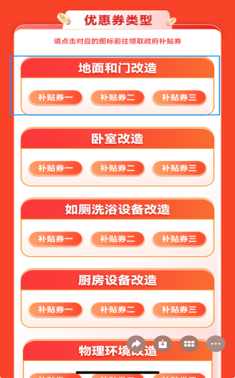 补贴范围:包含地面和门改造、卧室改造、如厕洗浴设备改造、厨房设备改造、物理环境改造、智能辅助产品6大类34小类商品。
