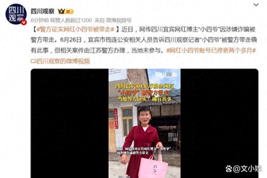 知名“小四爷”因涉嫌诈骗被警方带走!当地公安并未参与近日,一则关于四川宜宾网红博主“小四爷”因涉嫌诈骗被警方带走的消息在网络上引发轩然大波。6月26日,宜宾市筠连公安相关人员向媒体证实了这一消息,同时透露案件由江苏警方主导