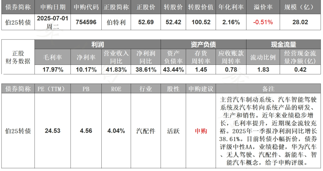 伯特利二期可转债7月1日(周二)打新申购,沪市转债,若持有正股,可进行配售。