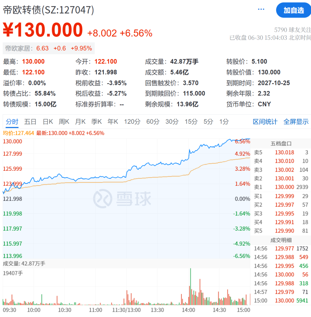 上个月被水华智云举牌的帝欧转债周一正股涨停,转债大涨6.56%,正好收于130元的强赎价。短短一个月时间,就完成了目标。