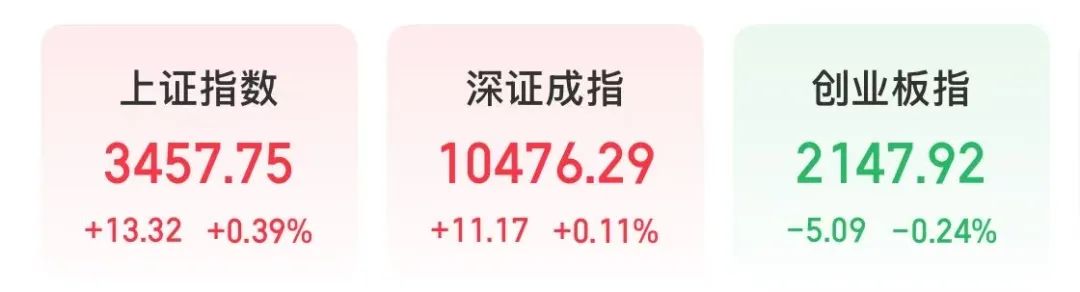 截至收盘,上证指数上涨0.39%,报收3457.75点,深证成指上涨0.11%,报收10476.29点,创业板指数下跌0.24%,报收2147.92点。